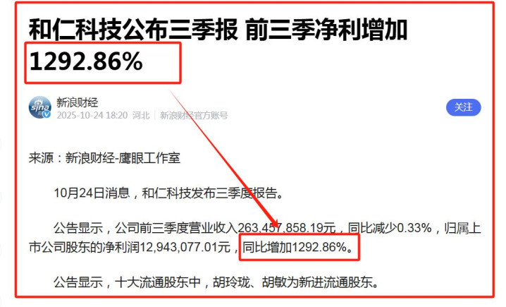 和仁科技三季度净利润同比增长1292.86%的数字已被打印在财经新闻的标题中。但公司股东总户数在三季度末增加了67户,户均持股市值从38.57万元增至42.47万元的变化,却少有人关注。